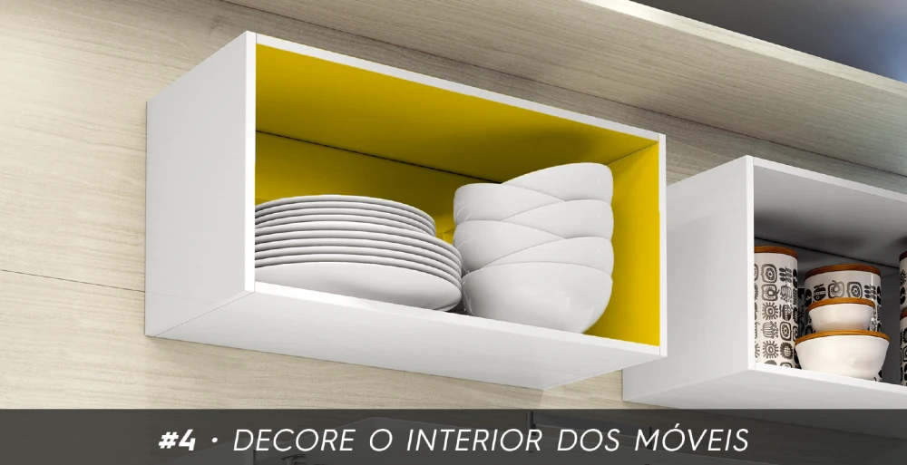 Falando em pintura, que tal ousar um pouco? Geralmente, a parte de dentro dos móveis não recebe muita atenção na hora da decoração. Uma boa dica para quem quer renovar o ambiente gastando pouco é mudar a cor das superfícies internas de armários, nichos e prateleiras. Você pode fazer isso com tinta ou até com papel contact. Essa mudança pode parecer pequena, mas é um ótimo jeito de quebrar a monotonia.